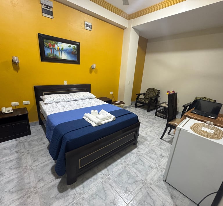 Amplia habitación para dos personas, con escritorio ideal para viajeros de negocios.